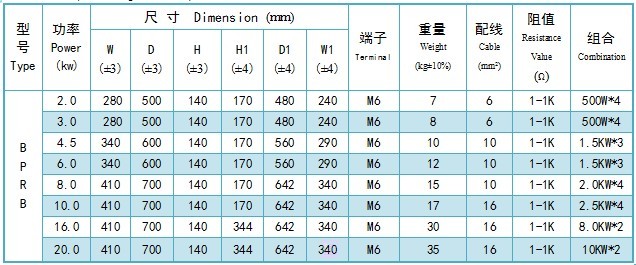 產(chǎn)品特點(diǎn)(Product Features) 1.額定功率范圍:2KW-20KW; 2.額定阻值范圍:1Ω-10KΩ 3.最大工作電壓:2KV; 4.耐壓范圍:AC3KV 50Hz/1min 5.額定溫升:375℃; 6.溫漂范圍:≤400ppm/℃ 7.IP 等級(jí):IP00-IP23; 8.振動(dòng):1.5g 9.熱平衡時(shí)間常數(shù):1800S 10.載流體材料:0Cr25AL5