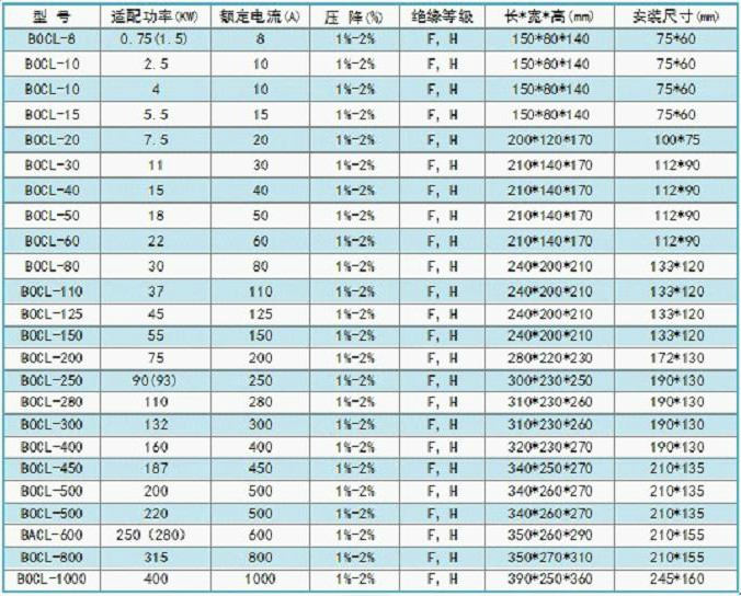 技術參數 (Technical Parameter) 1.額定工作電壓:380V/50Hz或者660V/50Hz 2.額定工作電流:3A至2000A/40℃ 3.抗電強度:鐵芯--繞組3000VAC/50Hz/5mA/10s無飛弧擊穿 4.絕緣電阻:1000VDC絕緣阻值≥100MΩ 5.電抗器噪音:小于65dB(與電抗器水平距離點1米測試) 6.防護等級:IP00 7.絕緣等級:F級以上