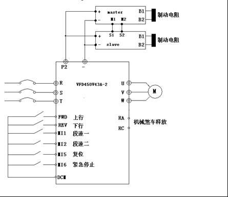 常見的卷揚(yáng)機(jī)噸位的范圍為:0.3T-30T卷揚(yáng)機(jī),型號則有約十多種,一些主要的型號中Jk表示快速卷揚(yáng)機(jī),Jm表示慢速卷揚(yáng)機(jī),Jt表示防爆卷揚(yáng)機(jī),單卷筒表示一個卷筒容納鋼絲繩,雙卷筒表示兩個卷筒容納鋼絲繩。該產(chǎn)品通用性高、結(jié)構(gòu)緊湊、體積小、重量輕、起重大、使用轉(zhuǎn)移方便,被廣泛應(yīng)用于建筑、水利工程、林業(yè)、礦山、碼頭等的物料升降或平拖,還可作現(xiàn)代化電控自動作業(yè)線的配套設(shè)備。 二、設(shè)備介紹: 本系統(tǒng)主要應(yīng)用臺達(dá)VE系列變頻器并合理配置博邦電氣BBU制動單元和BPRB制動電阻,對電動卷揚(yáng)機(jī)實現(xiàn)完美控制,把負(fù)載為10-12噸的貨物進(jìn)行升降、停止和平拖等動作。設(shè)備示意圖如下: