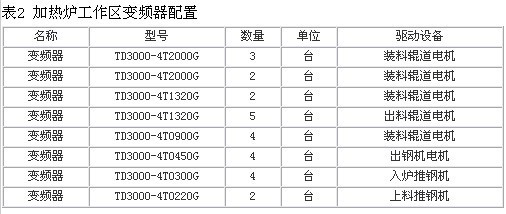 4.2多電機同步驅動系統配置 輥道是把鋼坯運送到加熱爐中進行加熱在把鋼坯運出的聯動運送設備,選用艾默生CT TD3000系列變頻器驅動多臺電機同時同步工作,制動電阻驗證矢量控制的精度,通過PROFIBUS-DP總線控制。加熱爐是對鋼坯進行預熱及達到均勻受熱。提高加熱處理的效果,提高產品質量。提高表面的加熱的退火(正火)后組織與確度均勻,加熱過程中使鋼的組織結構得到更好的完善,優化鋼坯的質量。加熱爐工作區輥道變頻器配置如表2所示。艾默生CT變頻器在鞍鋼新軋鋼冷軋1#、3#生產線工程軋機乳液裝置改造中應用EV2000-4T2800變頻器 6臺。 五、結束語 艾默生CT變頻器在鞍鋼集團公司的應用,充分的滿足了生產工藝和機械設備的要求,顯示變頻器優越的性能和極高的可靠性,得到用戶的好評與贊譽。豐富的規模化案例應用體現了艾默生CT變頻器從制動單元到大功率模塊式驅動技術的成熟,展示出大型驅動技術供應商的大規模工業解決方案的品牌集成優勢。