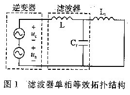 式中:Jk為k階貝塞爾函數(shù);Ed為直流母線電壓;a為調制深度;ωsw為載波角頻率(開關角頻率);ω1為基波角頻率。 可見諧波分布在以載波頻率及其整數(shù)倍為中心的頻帶上。只要濾波器傳函的轉折頻率遠小于開關頻率,就可以將輸出電壓的高次諧波濾除,再現(xiàn)基波正弦波信號。 當電機運行的時候,雙饋電機轉子繞組可以看成由反電勢構成的電壓源,其內阻抗為轉子漏感和轉子電阻。一般轉子電阻很小可以忽略。變頻器可以看成疊加了高次諧波的基波電壓源。濾波器是針對與變頻器輸出的電壓而言的,根據(jù)電路的疊加原理,在濾波器的設計時可以只考慮變頻器電壓分量。因此系統(tǒng)單相等效電路如圖1所示。圖1中,L為濾波電感;Cf為濾波電容;L1為轉子漏感3;uc為逆變器輸出電壓基波分量;uh為逆變器輸出電壓高次諧波分量。