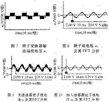 式中:ω1為基波角頻率;ωsw為載波角頻率。 進一步有效抑制諧振的措施就是在濾波電容支路串人一定的阻尼電阻,一般為諧振時容抗的三分之一,即Rd =1/(3ωresCf)。實際應用當中,轉子繞組以及線路本身電阻的存在通常可以對諧振起到阻尼作用,并且考慮阻尼電阻的引入會帶來系統(tǒng)功率的損耗,通常可以省去阻尼電阻。 三、設計實例 以轉子漏感L1=37.8 mH的4.5kW雙饋電機為例,考慮實際情況,轉子側變換器調制波的頻率變化范圍為0~15Hz即±30%的轉差;載波頻率為10kHz。下面為LC型正弦波濾波器的設計步驟。 1.取低頻時濾波電感的電壓降不超過5%,由式(1)設計出濾波電感為L=2mH。 2.根據(jù)式(2)得出濾波電容的取值范圍為C>0.06μF。 3.取開關諧波電壓的衰減倍數(shù)為2%,根據(jù)式(4)可以得到濾波電容和轉子漏感的并聯(lián)阻抗為Z=2.5SΩ從而可以計算出濾波電容為Cf =6.458μF,實際取Cf=6.8μF。 4.根據(jù)實際參數(shù),計算諧振頻率。實際諧振角頻率為ωres=8574.9rad,對應的諧振頻率為fres=1.36kHz,顯然滿足式(6)。 四、實驗結果 根據(jù)以上的參數(shù),研制了一套用于雙饋電機轉子側變換器輸出的LC型正弦波濾波器。并做了相應的實驗。實驗波形如圖5~圖10所示。實際濾波器測試實驗條件為:用一臺直流電動機拖動雙饋電機運行于發(fā)電狀態(tài),定子帶電阻型負載,轉子側變換器提供交流勵磁;雙饋電機轉速為346r/min,轉子轉差頻率大約為38.5:Hz。