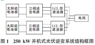以由兩臺125 kW 三相逆變器并機組成的250kW 光伏逆變系統為例, 其常用的結構框圖如圖1所示。其中三相逆變電路采用多電平逆變拓撲,濾波器采用LCL 型濾波器,為了保證濾波器有足夠的零序電抗器,前級濾波電抗器需要采用3 個獨立的單相鐵硅粉芯電抗器組成;后級濾波電抗器由于電流諧波較少,可以采用價格相對便宜的三相硅鋼電抗器[6]。